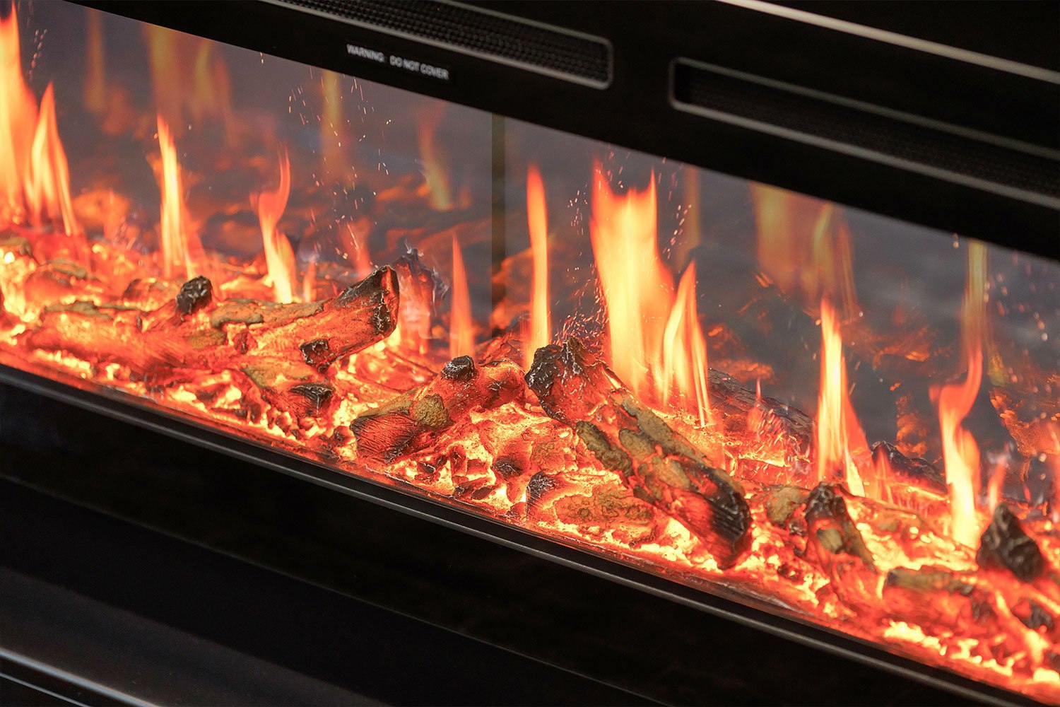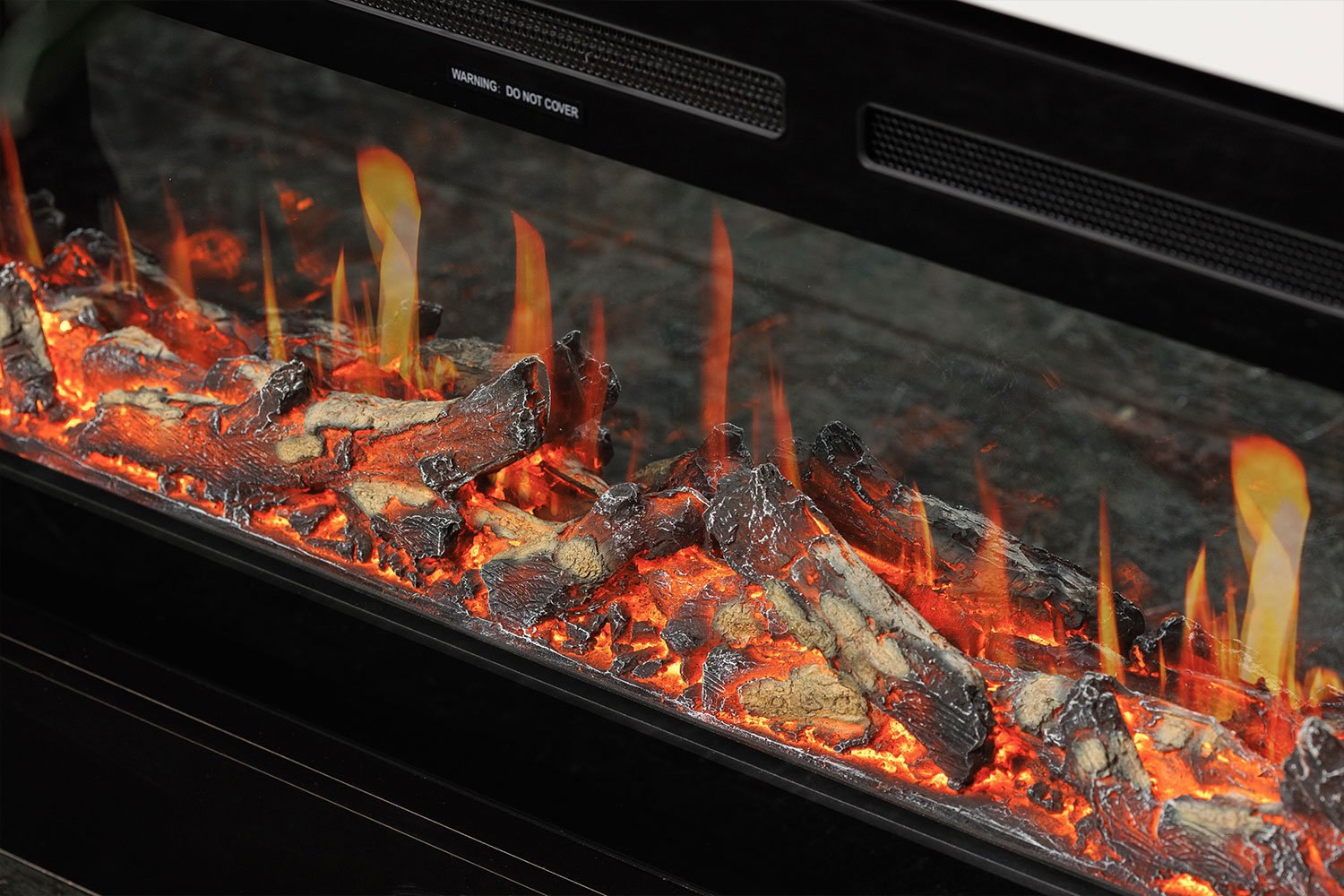 The Mystflame V-Art 60 wall-mounted electric fireplace belongs to the 5D electric fireplace category and provides a more realistic flame display compared to conventional LED fireplaces. The back of the fireplace features a high-resolution screen that shows videos of flames, sparks, and smoke.