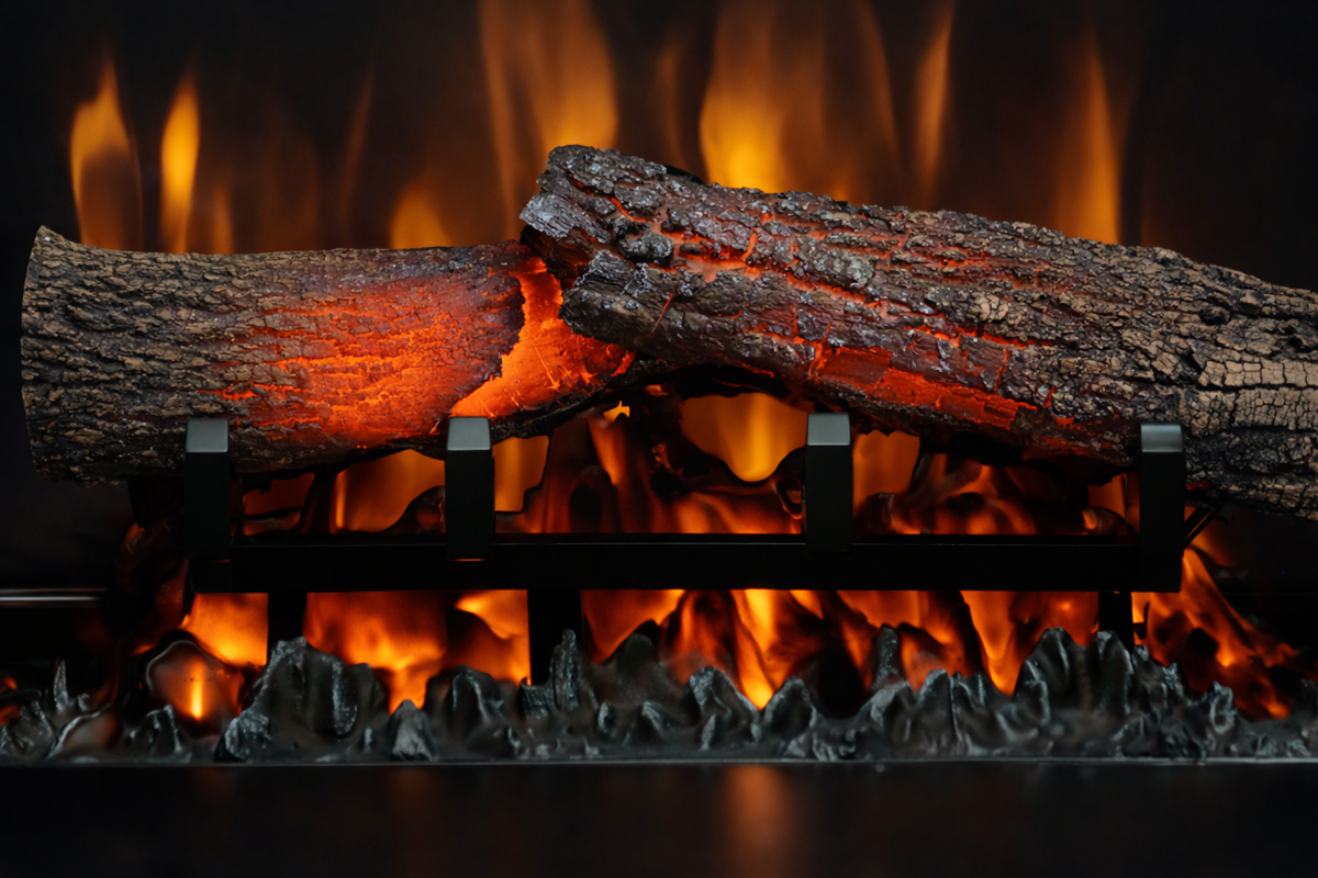 Gracias a ello se crea un efecto de troncos parcialmente quemados, muy cercano al aspecto de la leña real. Además, los troncos incorporan iluminación LED integrada, que parpadea suavemente y genera un auténtico efecto de brasas incandescentes.